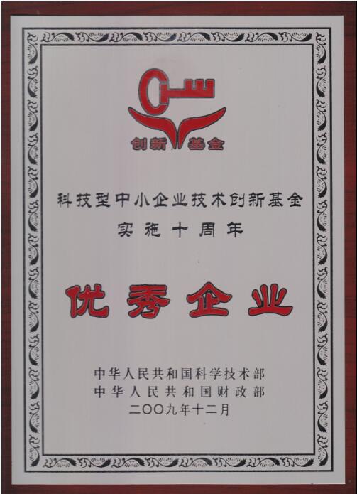 在科技部和财政部召开的科技型中小企业技术创新基金实施十周年总结大会上,我公司被授予“全国科技型中小企业技术创新基金工作优秀企业”荣誉称号。