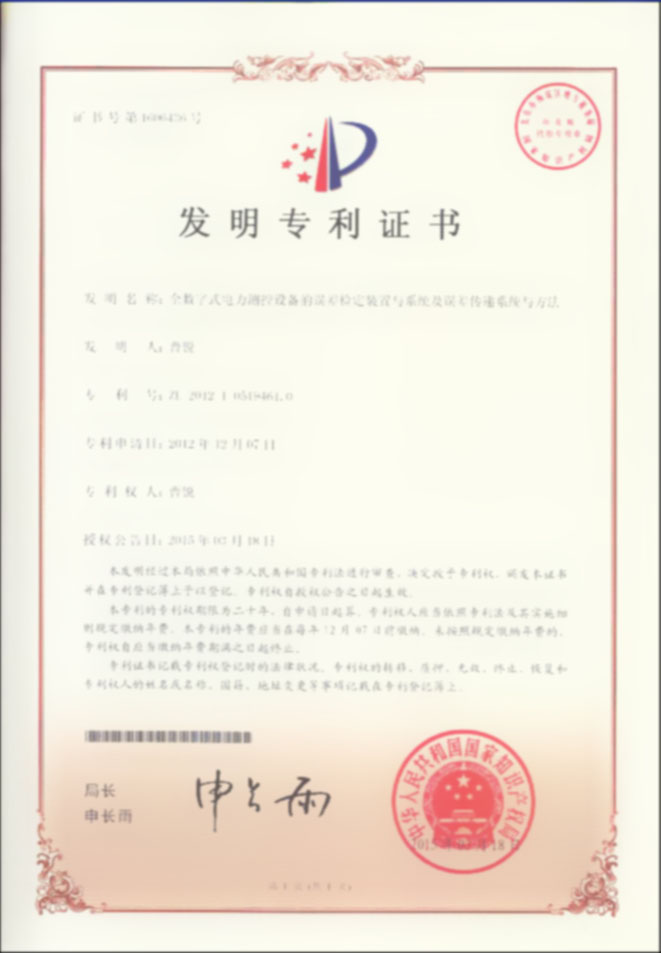 2015年3月,我公司获得“全数字式电力测控设备的误差检定装置与系统及误差传递系统与方法”的发明专利授权。