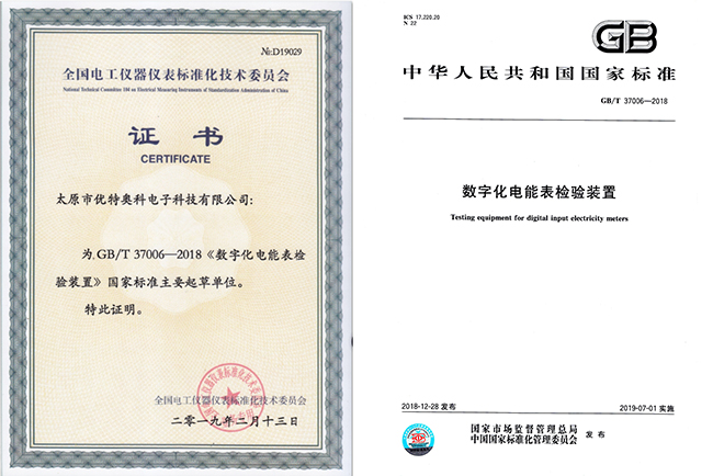 优特奥科作为主要起草单位的国家标准《GB/T37006-2018数字化电能表检验装置》于2018年12月28日发布,2019年7月1日实施。