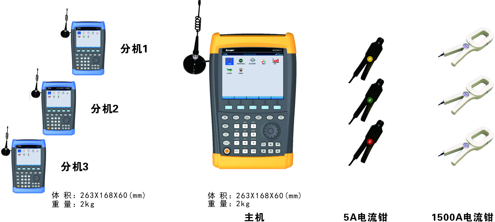 一个典型的AP2003JC用电稽查系统由一台主机和两到三台分机组成(分机数量可以根据用户需求进行配置)。适用于检测具有两到三台或更多变压器的10KV高压用户。主机和分机之间无电缆连接,采用无线通讯。主机只需在高供高计三相电能表处采样电压、电流,而分机则在变压器低压处取样电压,并用大电流钳型表进行电流取样,最后即可在主机上显示出整个系统的综合误差。
