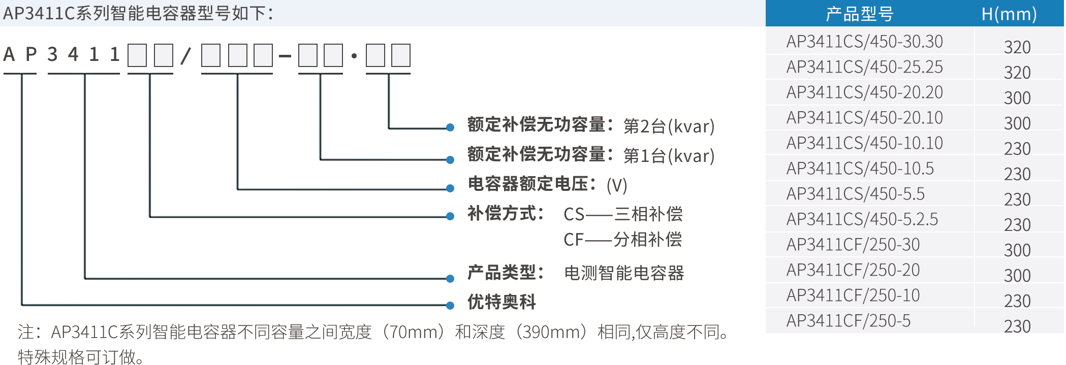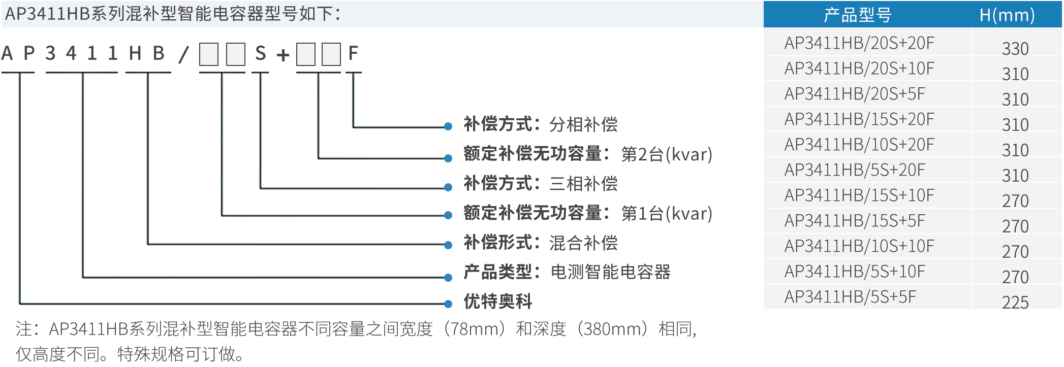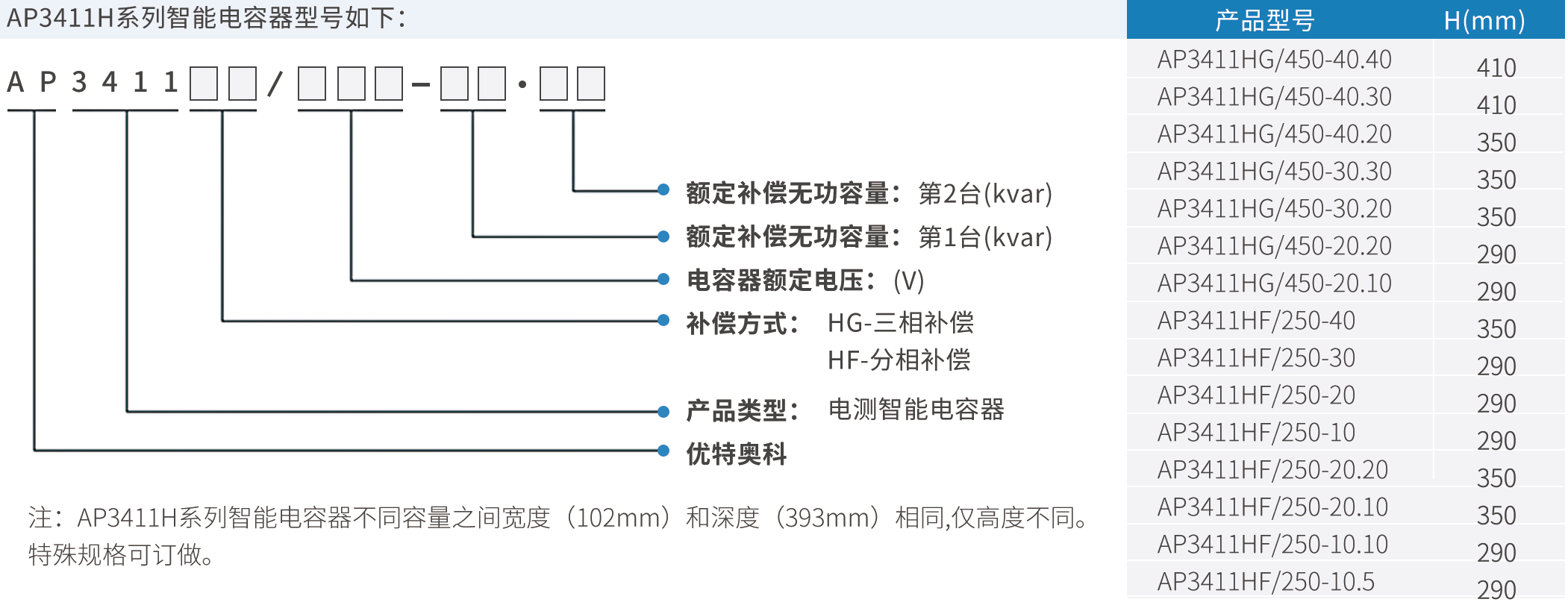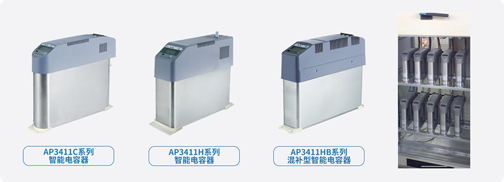 AP3411C系列智能电容器是由智能测控单元、同步零投切开关、智能保护单元、组网单元、显示单元、两台(△型)或一台(Y型)低压自愈式电力电容器组成一个独立完整的智能无功补偿系统。产品既可单台使用,也可多台组网构成补偿系统使用;既可配套AP系列低压无功综合测控仪使用,也可使用二次电流互感器直接构成补偿系统使用;既可三相补偿,也可三相和分相混合补偿。AP3411C系列智能电容器应用于电网谐波含量较低的低压电力系统中,可靠运行,提高系统功率因数,降低线损,提高电网电能质量。 AP3411H系列智能电容器,除具备AP411C系列产品的所有功能外,还可以实现更大补偿容量(40+40)Kvar,更大分断能力(采用塑壳断路器)Icu≥20KA。 AP3411HB系列混补型智能电容器是由智能测控单元、零投切开关、智能保护单元、一台(△型)和一台(Y型)低压自愈式电力电容器组成一个独立完整的智能补偿单元,替代由智能无功控制器、熔丝(或微断)、晶闸管复合开关(或接触器)、热继电器、低压电力电容器多种分散器件组装而成的自动无功补偿装置。