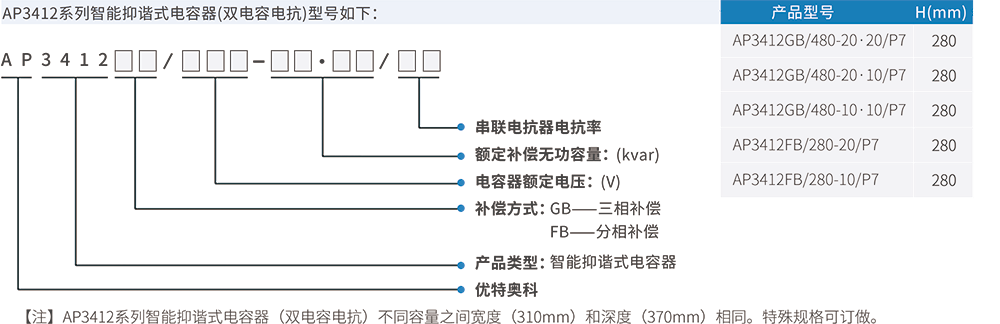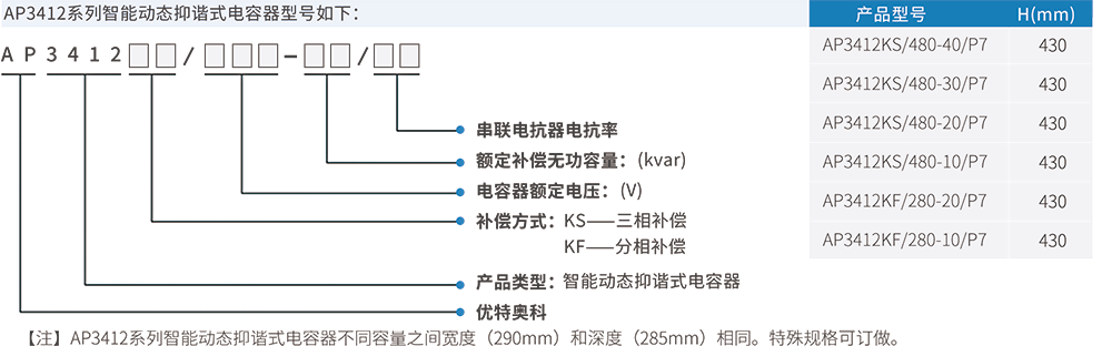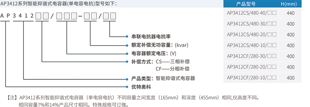 AP3412系列智能抑谐式电容器是由智能测控单元、同步零投切开关、智能保护单元、组网单元、显示单元、一台/两台(△型)或一台(Y型)低压自愈式电力电容器、高品质电抗器组成的智能无功补偿系统。产品具有模块化、标准化、免维护等特性,具有零投切、分级补偿、过电流/过电压/过温度保护、故障自诊断、测量、通信、信号、联机等功能。AP系列智能抑谐式电容器应用于电网谐波含量严重的低压电力系统中,能够安全可靠运行,不会产生谐波,对谐波无放大作用。有效的提高了系统功率因数,降低线损,提高电网电能质量。 AP3412系列智能动态抑谐式电容器是由智能测控单元、大功率晶闸管投切开关、智能保护单元、组网单元、显示单元、低压自愈式电力电容器、高品质电抗器、放电及风冷单元组成的智能无功补偿系统。产品具有模块化、标准化、免维护等特性,具有快速零投切、分级补偿、过电流 / 过电压 / 过温度保护、故障自诊断、测量、通信、信号、联机等功能。